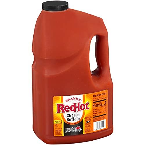When you want to add a bold Buffalo taste to your menu, you need Frank's RedHot Xtra Hot Buffalo Wings Sauce. This blend triples the signature heat found in the original Frank's RedHot. While this flavor profile is undeniably spicy, the special formula ensures this sauce still delivers the perfect balance of flavor and heat. Frank's RedHot Buffalo Sauce uses real, select, aged red cayenne peppers to get that rich, natural, spicy flavor. Then, industry experts take these peppers and blend them with premium ingredients like garlic powder, paprika and natural butter flavor to ensure consistency and quality. The result is a degree of heat that you won't find in ordinary hot sauces.Culinary professionals will appreciate that this extra hot sauce comes in a ready-to-use container. You'll save time and effort in the kitchen without sacrificing flavor. Each 1-gallon jug gives you plenty of hot sauce to infuse your menu items with a bold Buffalo taste. All you have to do is give the bottle a good shake, then toss, drizzle or pour some on your dishes to achieve a robust aroma and high heat.Whether you serve appetizers, snacks, sides, entrees or drinks, Frank's RedHot Xtra Hot Buffalo Wings Sauce will add a fiery kick. It enhances the taste of meats like chicken, beef and ribs. This sauce also pairs well with salmon, fish tacos and meatballs. Add some to your signature dips, dressings or sauces. You can even incorporate some of this extra hot sauce into bloody marys for additional heat.Without a doubt, this bulk buffalo hot sauce will quickly become a kitchen staple. This mouthwatering addition is made without high fructose corn syrup, is dairy-free and gluten-free, allowing you to treat your customers to all your recipes and accommodate their dietary needs. Because it's kosher and vegetarian, you'll be able to treat even more people to amped-up dishes.