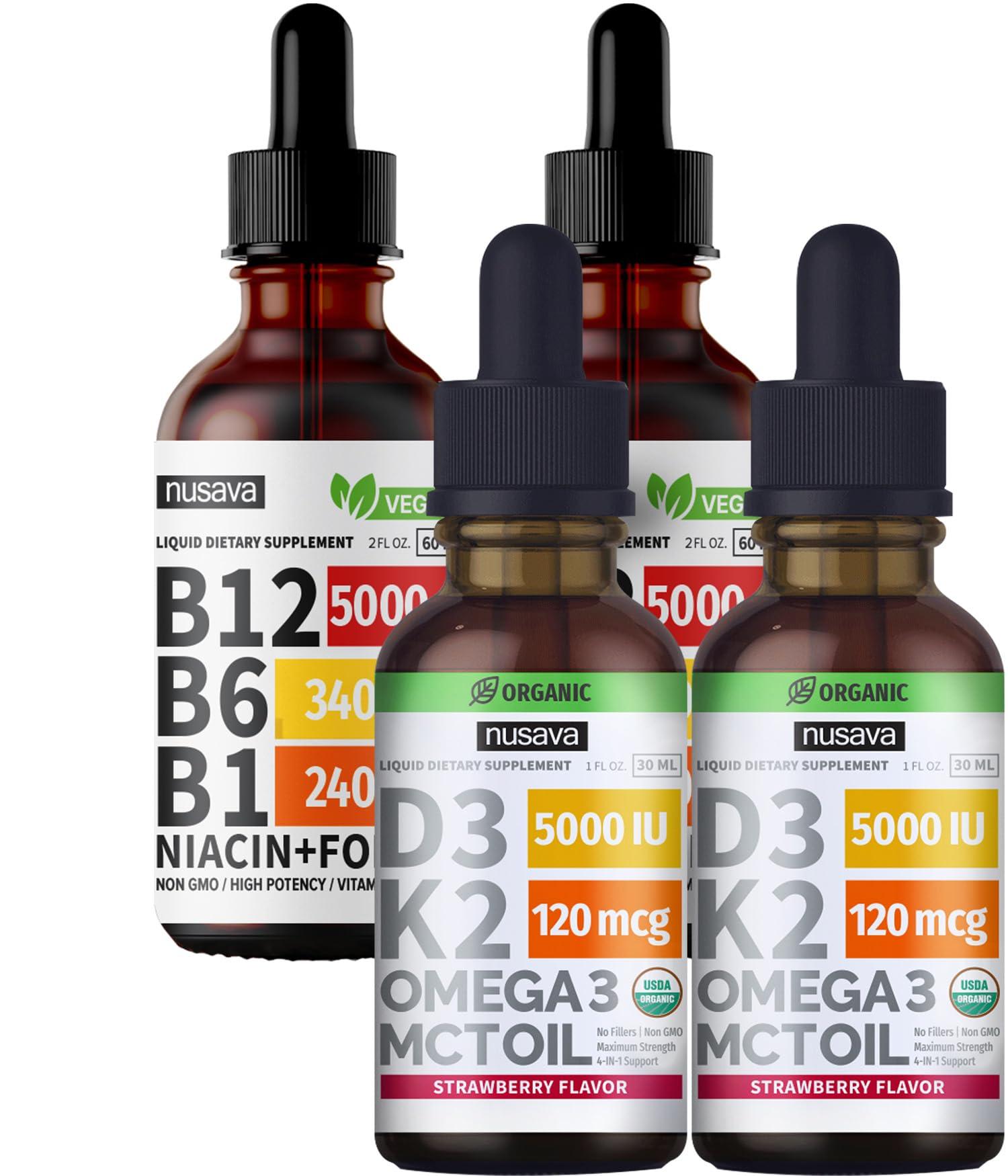 Get your daily dose of essential multivitamins with Nusavas holistic supplement duo: Strawberry Flavored D3 K2 Liquid Drops and Vitamin B12 Liquid Drops. The Nusava Vitamin D3, Vitamin K2, Omega-3, and MCT Oil supplement is designed to be a convenient all-in-one liquid vitamin D. It's a 4-in-1 maximum strength supplement that comes in a 1 fl. oz/30 ml dropper bottle, providing 30 servings per bottleequivalent to 2 months' worth of potent Vitamin D K2 support. The Nusava D3 K2 Vitamins aim to assist your body with comprehensive support ranging from bone growth, muscle development, and energy metabolism to immunity, joint integrity, and heart. Meanwhile, Nusava B12 Drops take it up a notch with its potent 5-in-1 B Vitamin formula, providing comprehensive benefits. Each serving contains a blend of essential B vitamins, including a high dose of Vitamin B12 (as Methylcobalamin), Vitamin B6 (as Pyridoxine Hydrochloride), Vitamin B1 (as Thiamine Mononitrate), Vitamin B3 (Niacin), and Vitamin B9 (Folate). This meticulously crafted blend ensures you receive the full spectrum of B vitamins, each working synergistically to optimize various bodily functions. Elevate your well-being today with this exceptional bundle of (2) bottles of Strawberry Flavored Vitamin D3 K2 Liquid Drops and (2) bottles of Vitamin B12 Liquid Drops.