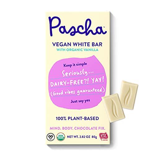 - Nut free, soy free, gluten free, dairy free, plant based chocolate. Welcome to the delicious healthy chocolatey world of Pascha. This bar is a vegan organic white chocolate alternative, made with organic cocoa butter and using rice milk instead of dairy milk. We use a little vanilla to round out the flavor of the organic cocoa butter.