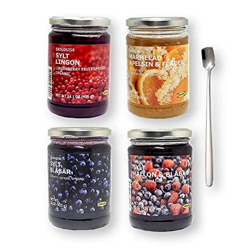 Tasty Kitchen IKEA Organic Preserves 4-Pack Bundle - Total 4 Flavors - SYLT LINGON Lingonberry, Blueberry, Raspberry & Blueberry Jam & Orange & Elderflower Marmalade (15 oz) with Bonus Spreader Spoon