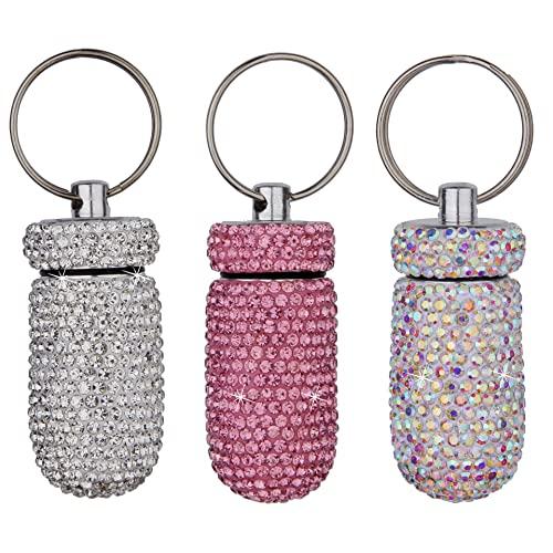 Ykybhx 3PCS Bling Crystal Rhinestone Portable Pill Case Pill Container Waterproof Pill Holder with Keychain Glitter Travel Pill Box Small Medicine Dispenser Bottle Storage for Outdoor Camping Travel